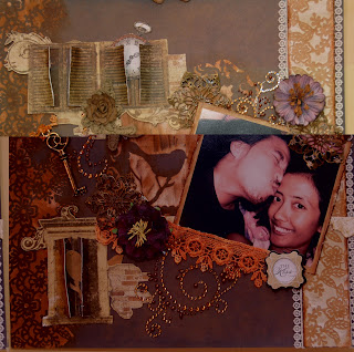 This page I called "The Kiss." I join mix media scrapbooking class with Mrs. Karin from MSI as my mentor. This is it! We put acrylic paint on the left and right edges as well as the center, then we use distress ink to make vintage effect on the left side. Acrylic base paint is easy to dry so I don't have to wait too long because the class only last 2 hours..too bad..hahaha.